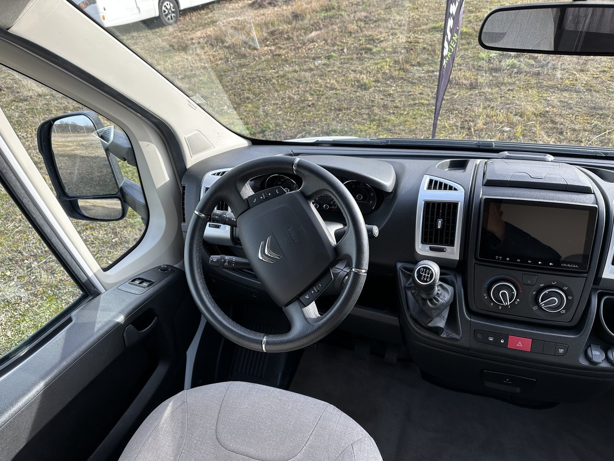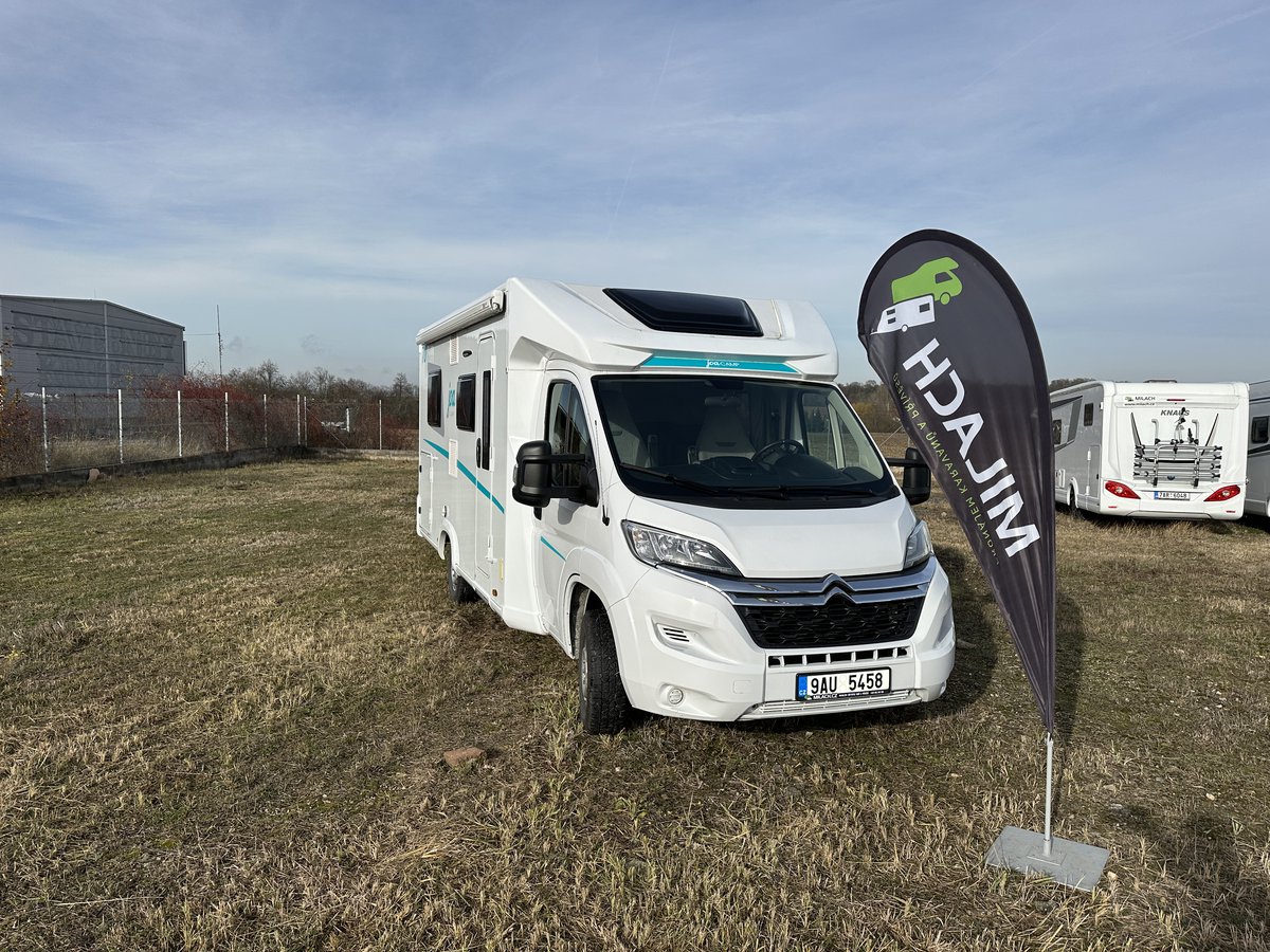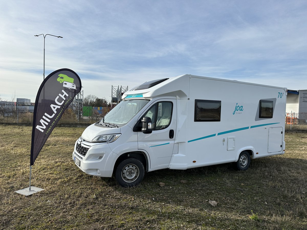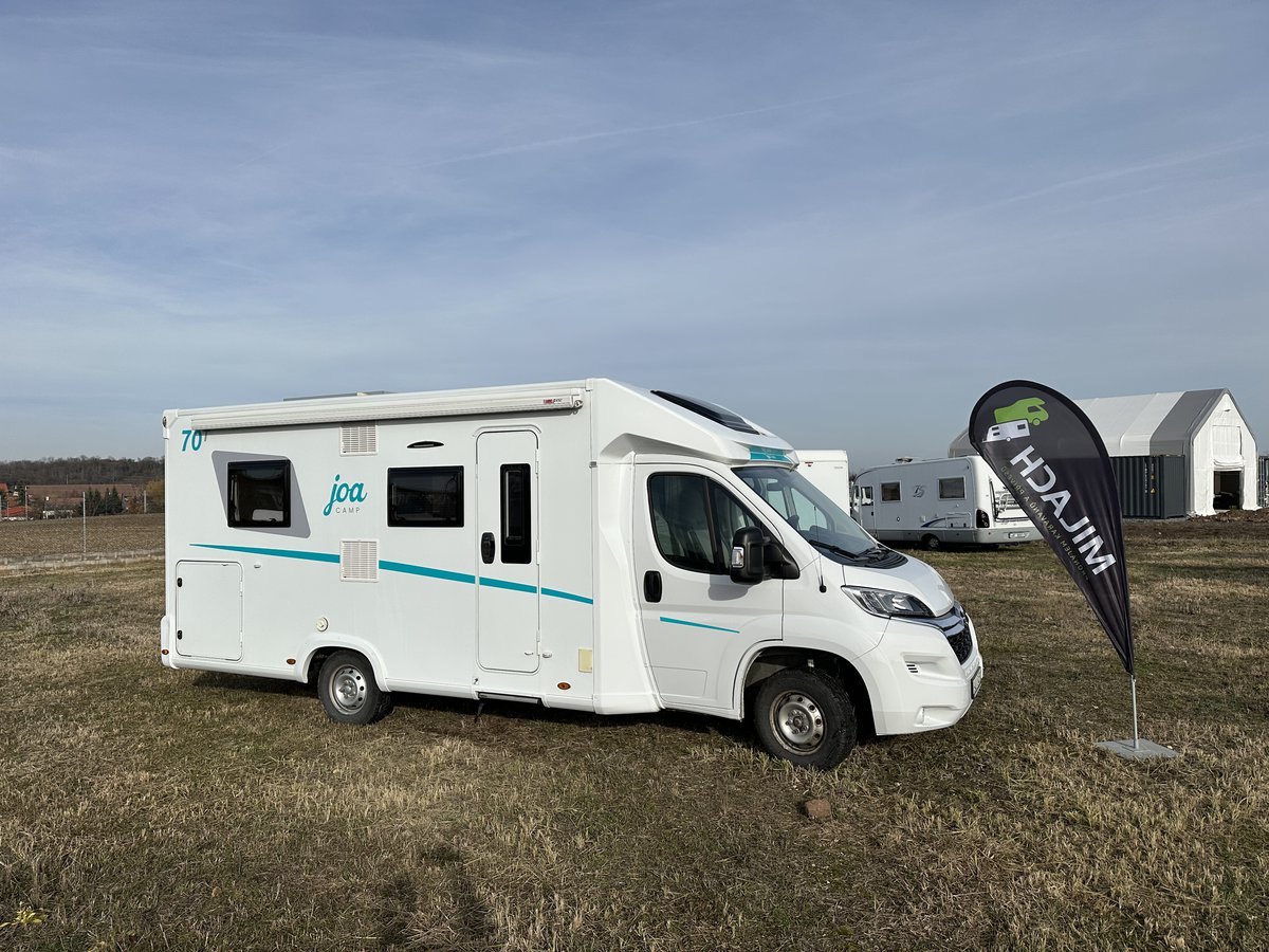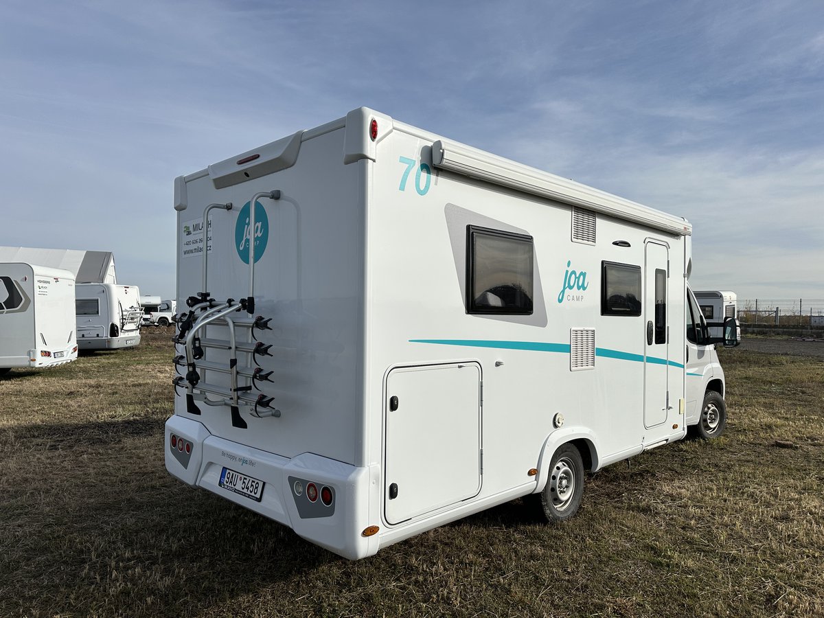 Polointegrovaný vůz Joa 70T ve velmi dobrém stavu, model 2023, pro 4 osoby na jízdu i spaní, perfektní výbava, Citroën 2.2, 165k, 16" ALU kola Citroën (na fotce zimní 15"), látkové čalounění, monocontrol, osvětlení garáže, zpětná kamera s 8" rádiem, zatemnění kabiny, přídavná matrace na stůl pro vytvoření dalšího lůžka, světlý matný povrch skřínek, tmavá kuchyňská deska a stůl, moskytiéra ve dveřích, prosklené dveře nástavby, el. schůdek, booster 25A, solární panel, markýza Fiamma 4m, otočné přední sedačky, izolovaná a vyhřívaná odpadní nádrž, topení Truma Combi 4, volant a řadicí páka v kůži, nosič na 4 kola, vyhřívaná garáž přístupná z obou stran, možnost vytvoření velkého letiště mezi zadními oddělenými lůžky, chromované budíky na přístrojové desce, ovládání rádia na volantu a mnoho dalšího